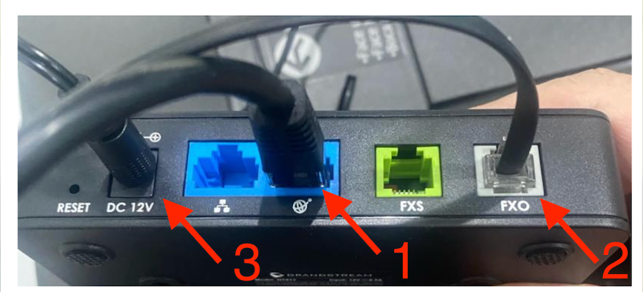 How to connect a Grandstream FXO ATA Gateway. Follow below instructions on how to connect your FXO Gateway Step1: Connect the Internet LAN Cable to the WAN (1) port Step2: Connect the Phone RJ11 Cable to the FXO (2) port Step3: Connect the Power Cable (3) TIP: To reboot the device unplug the power cable, wait for a few seconds and reconnect the power cable.